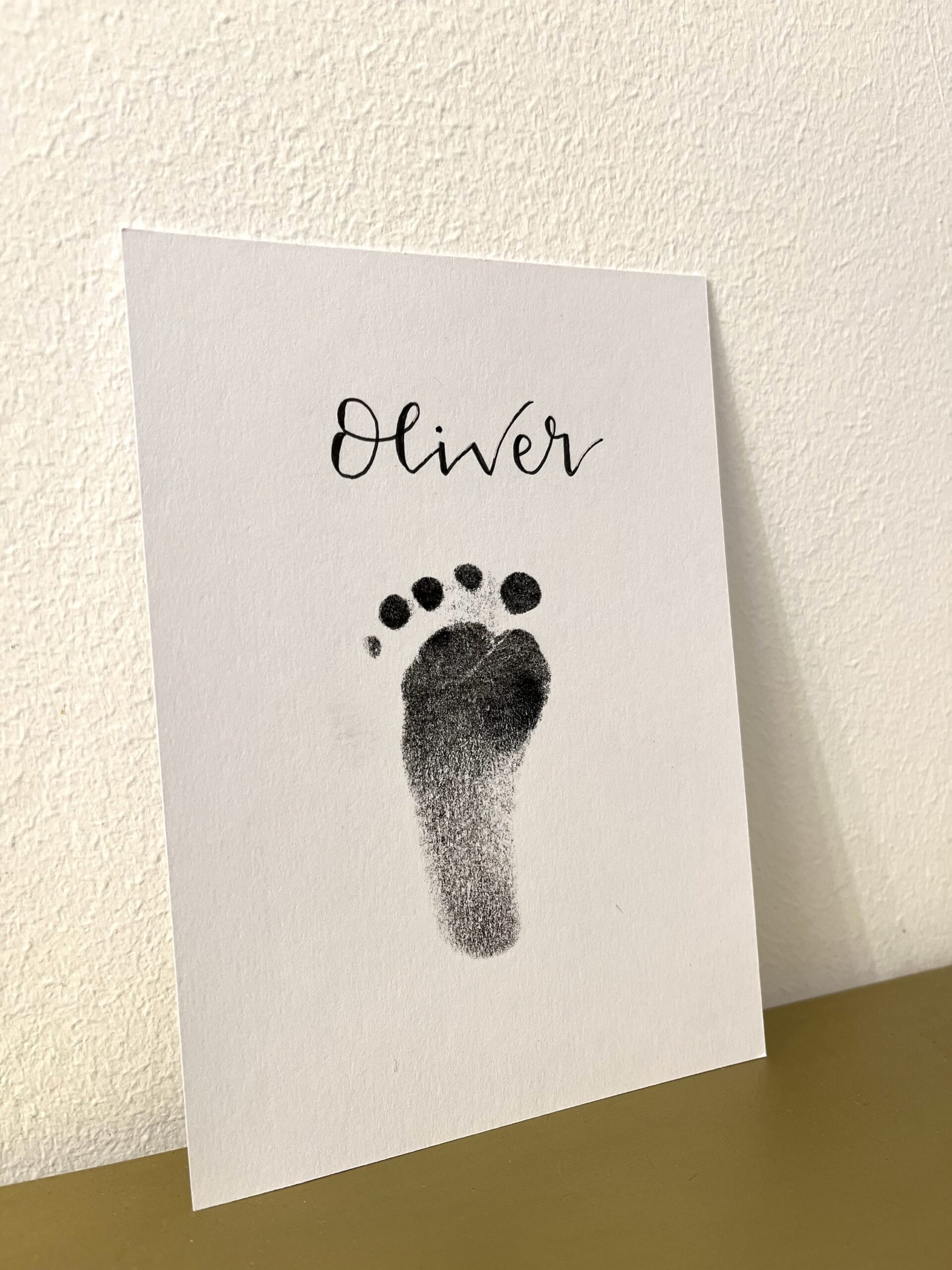 Each kit includes one inkless print pad and two A6 cards, personalised by me in advance. You simply make the prints at home by pressing a hand or foot against the pad, it’s super easy – no mess, no stress, and no ink ever touches the skin.